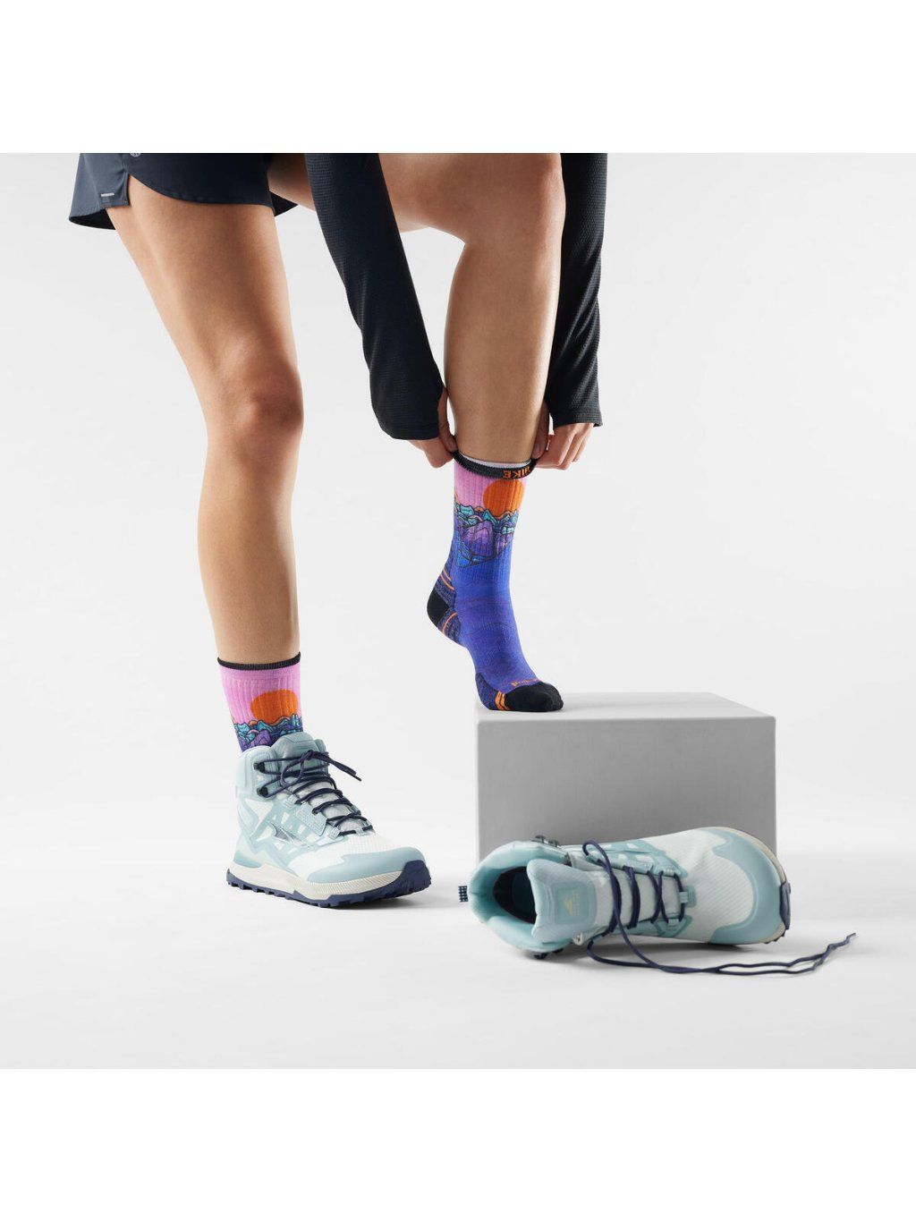 Ještě jsme nenarazili na cestu, která by se nám nelíbila. Totéž platí pro naše dámské ponožky Cushion Mountain Sunrise Print Crew navržené sportovcem a umělcem Brooklynem Bellem. Model s přesným tlumením tam, kde to nejvíce potřebujete, a ve specifickém střihu pro dámskou postavu, vám dodá pocit pohodlí na každém kilometru. Ponožka je vyrobena ze zodpovědně získávané vlny merino a vylepšena o technologii Indestructawool™, která zvyšuje odolnost. Špička Virtually Seamless™ zase zajišťuje větší pohodlí. Systém 4 Degree™ Elite Fit navíc nabízí funkční střih se strategickými strečovými a síťovými zónami, které podporují prodyšnost a zároveň pomáhají chránit před puchýři. Tento model vám tak pomůže jít ještě dál bez ohledu na to, jak daleko jdete.